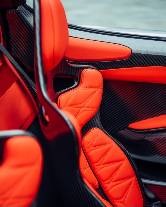 Material berkualitas tinggi seperti kulit, serat karbon, dan aluminium memberikan sentuhan mewah dan sporty. Kursi bucket yang ringan memberikan dukungan yang sangat baik saat berkendara dengan kecepatan tinggi. Setir berdiameter kecil memberikan umpan balik yang tajam dan presisi.