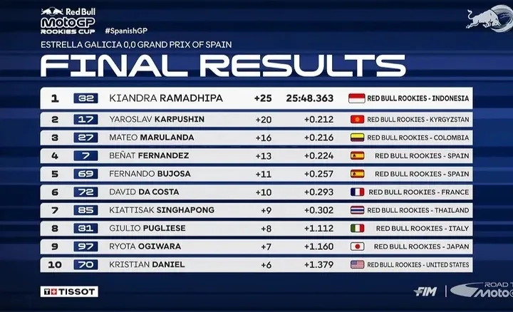 Start dari posisi ke-17, Ramadhipa berhasil melakukan comeback luar biasa hingga menyentuh garis finis sebagai pemenang, sebuah hasil yang jarang terjadi di level kompetisi pembinaan menuju MotoGP tersebut.