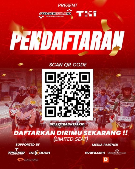 Seluruh kegiatan ini gratis alias HTM Free, namun kuota peserta terbatas. Bikers yang ingin bergabung cukup melakukan pendaftaran melalui tautan bit.ly/TrackTalkID atau memindai QR code yang tersedia pada poster resmi acara.